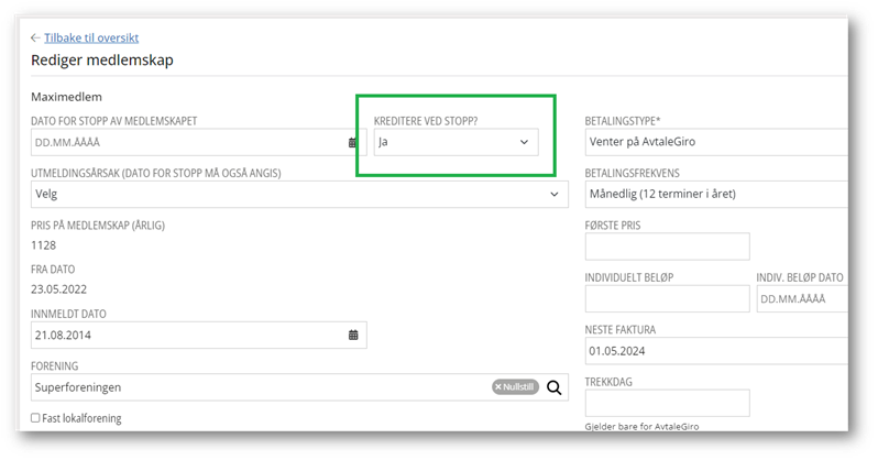 Frem til nå har vi automatisk kreditert utestående fakturaer når medlemskap og abonnement avsluttes. Nå er det mulig å selv styre om automatikken skal gå eller ikke. Vi har utvidet med nytt felt for å angi ja eller nei til kreditering. På den måten får du full kontroll over automatikken.